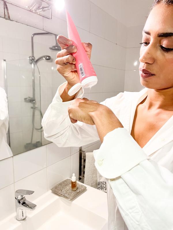 A minha pele é seca e o conforto Hidratação Intensa são poderosos aliados. Nos dias mais frios ou de vento, limpo a pele e ofereço-lhe um banho de hidratação.
